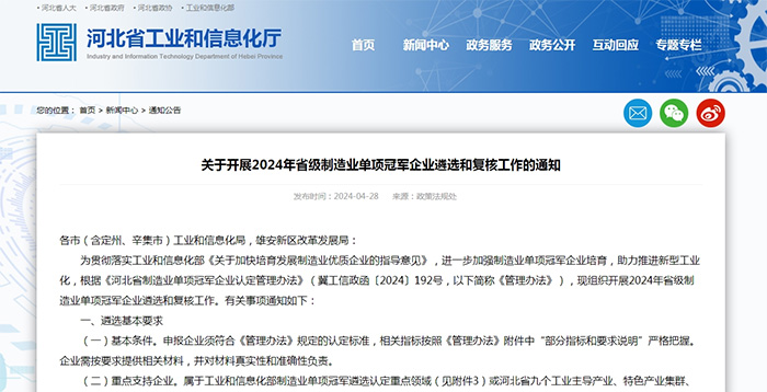 據(jù)介紹,河北省制造業(yè)單項(xiàng)冠 軍企業(yè)旨在表彰長期專注于制造業(yè)特定細(xì)分領(lǐng)域,創(chuàng)新基礎(chǔ)條件和技術(shù)創(chuàng)新能力優(yōu)異,生產(chǎn)技術(shù)或工藝水平達(dá)到國際先 進(jìn)國內(nèi)領(lǐng) 先水平,單項(xiàng)產(chǎn)品市場占有率位居全 球或全 國前列的企業(yè)。